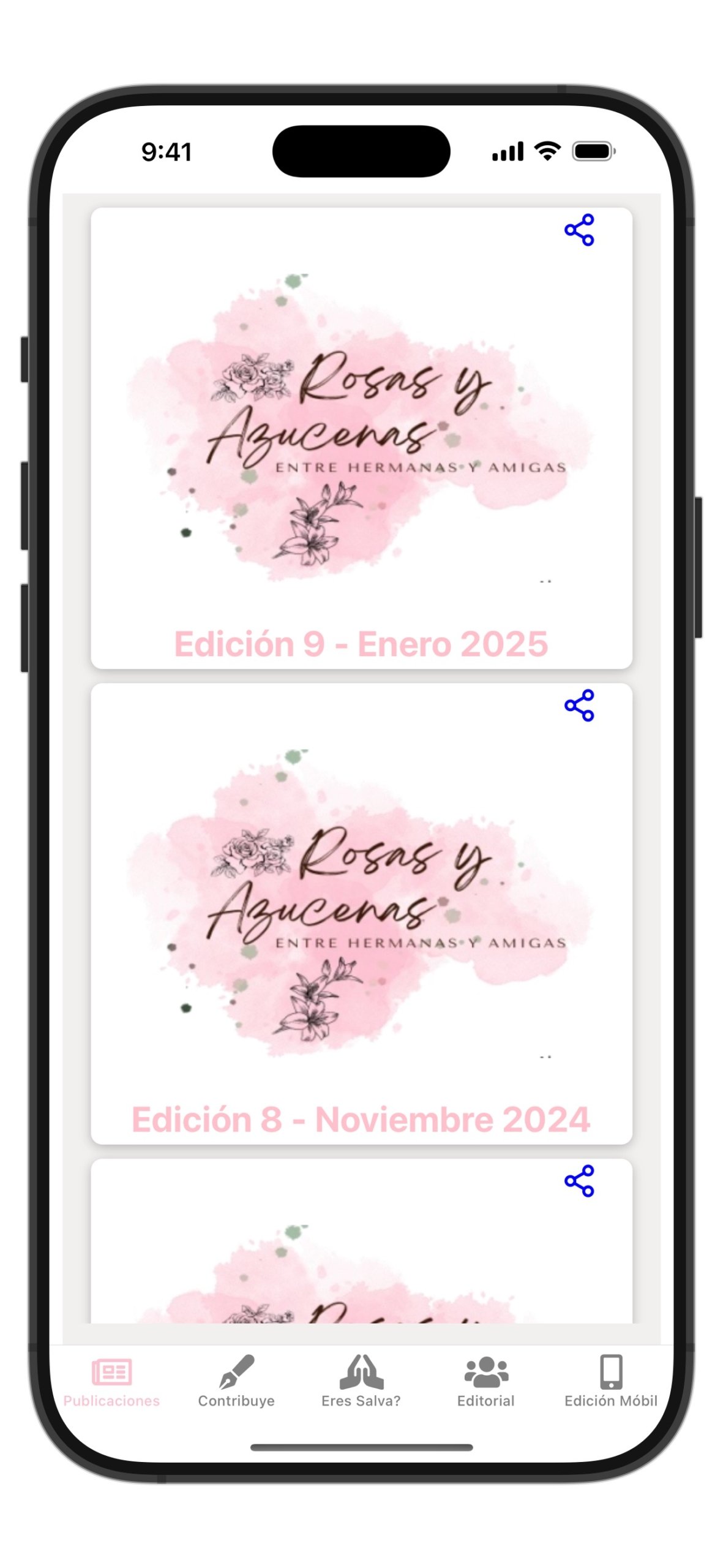 Esta sección permite a los usuarios explorar todas las ediciones disponibles de la publicación “Rosas y Azucenas”. Los usuarios pueden ver la lista de publicaciones, compartirlas con amigos y acceder a un visor de PDF.